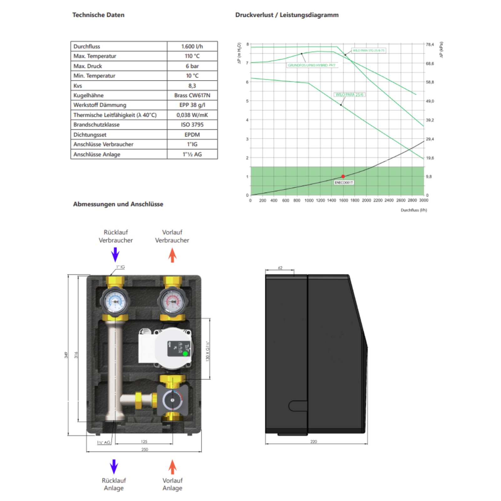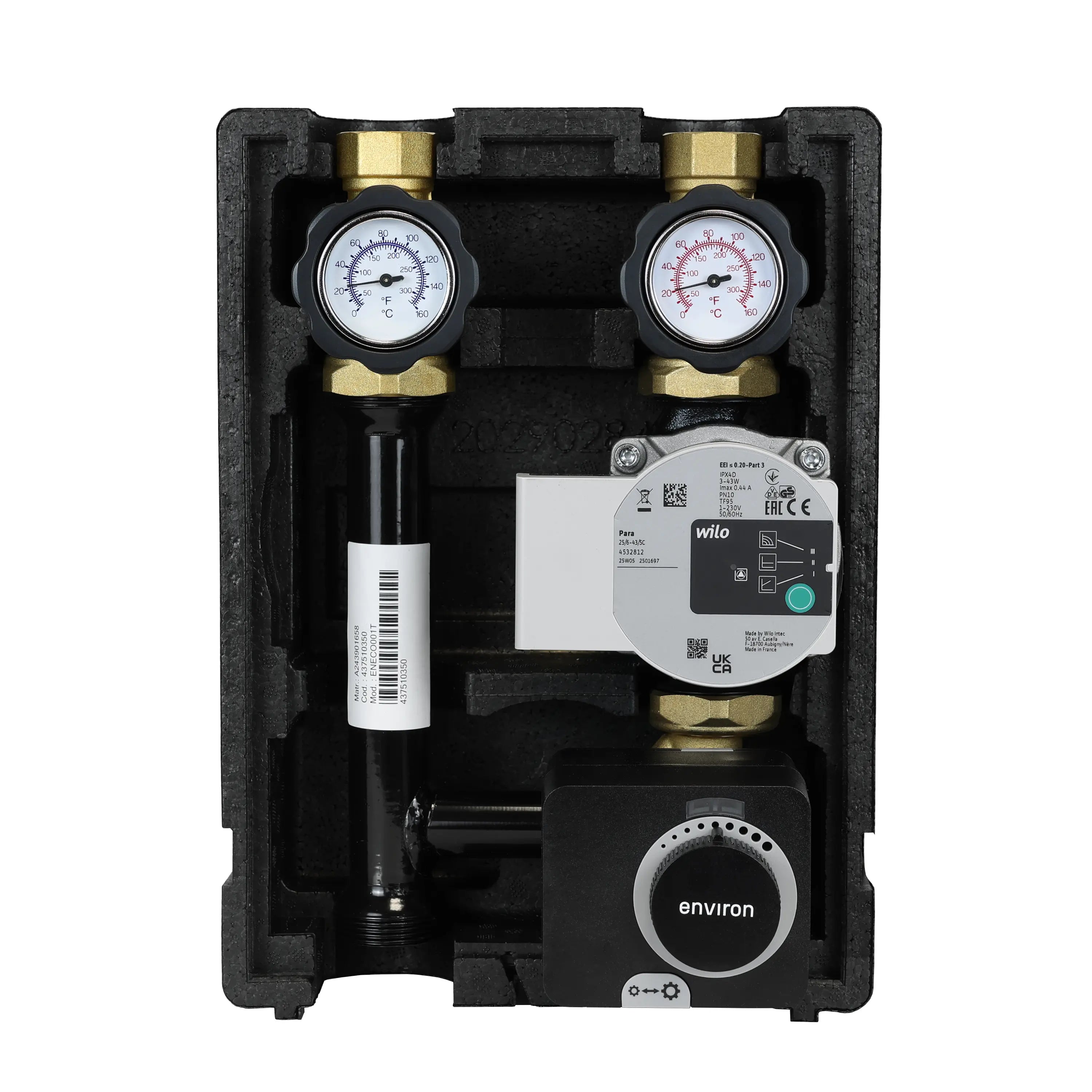 - Einbaufertige EcoMix ENT001 Heizkreispumpengruppe mit Drei-Wege-Mischer, Environ END05 Stellmotor und einer der folgenden Hocheffizienzpumpen: Ecostar II 25/6, Ecostar II 25/8, Wilo Para 25/6, Wilo Para STG 25/8,75. Inklusive Netzkabel.