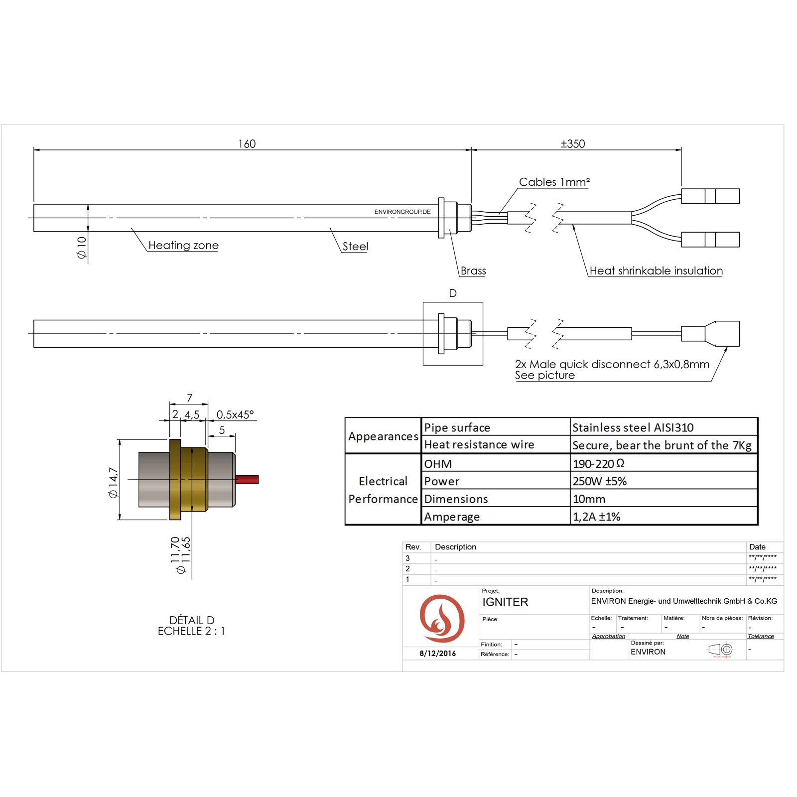 Environ Zündelement Edelstahl Ø10mm x 150mm – 280W, 230V Glühzünder mit 3/8" Gewinde